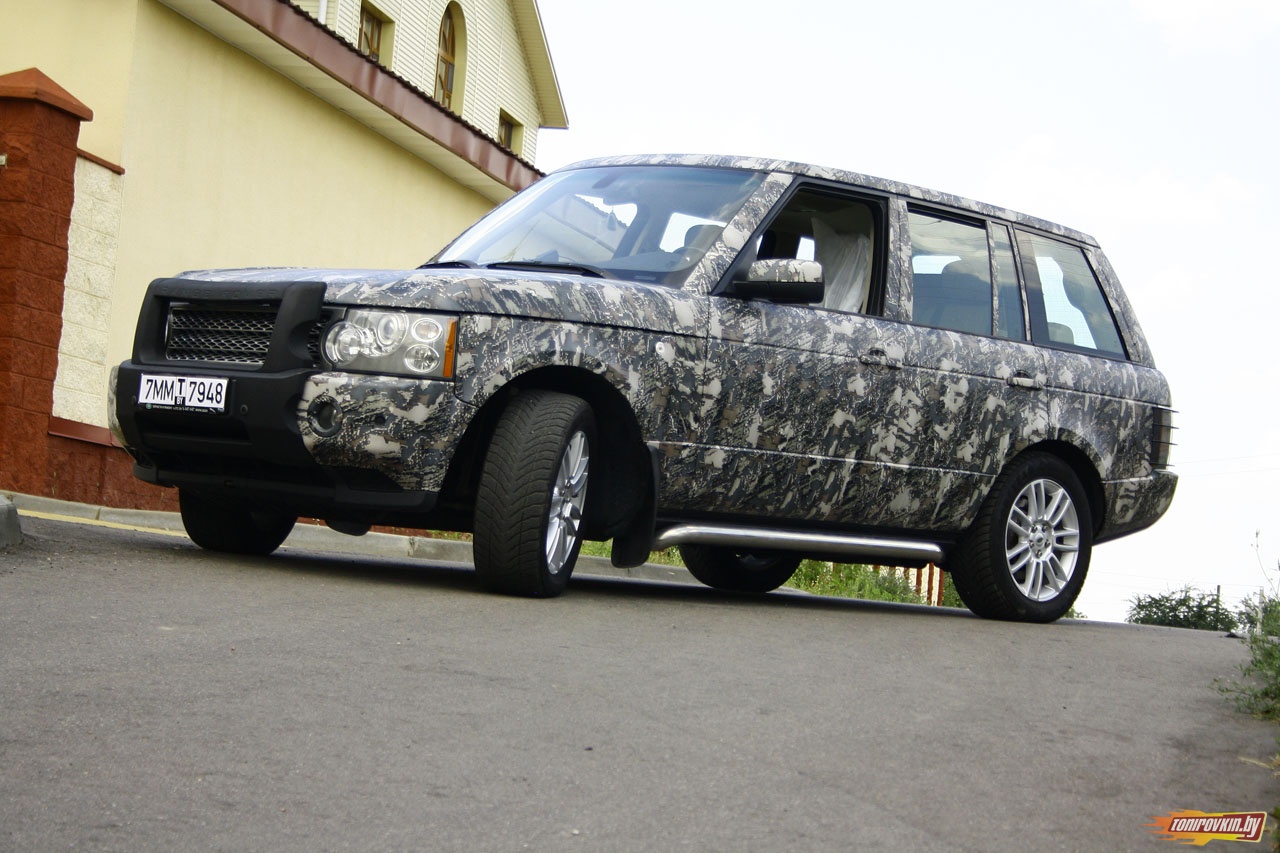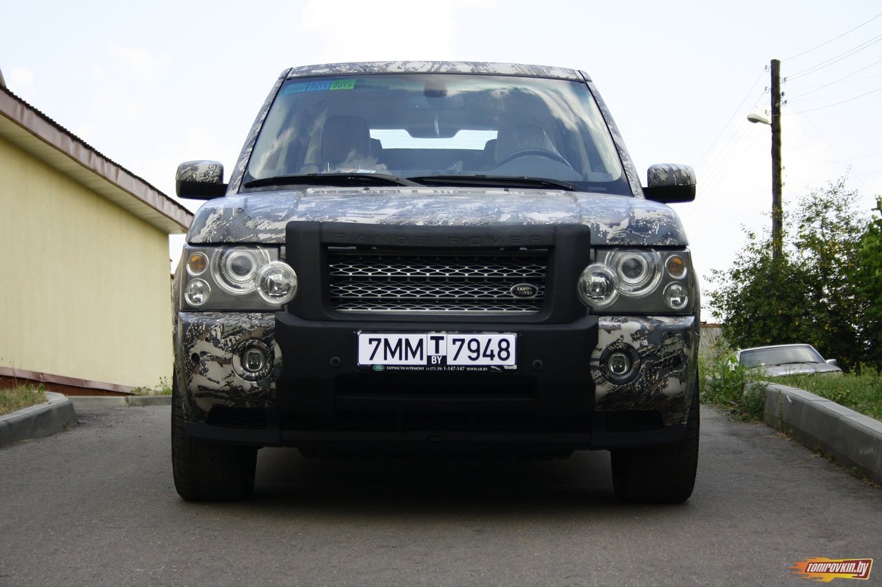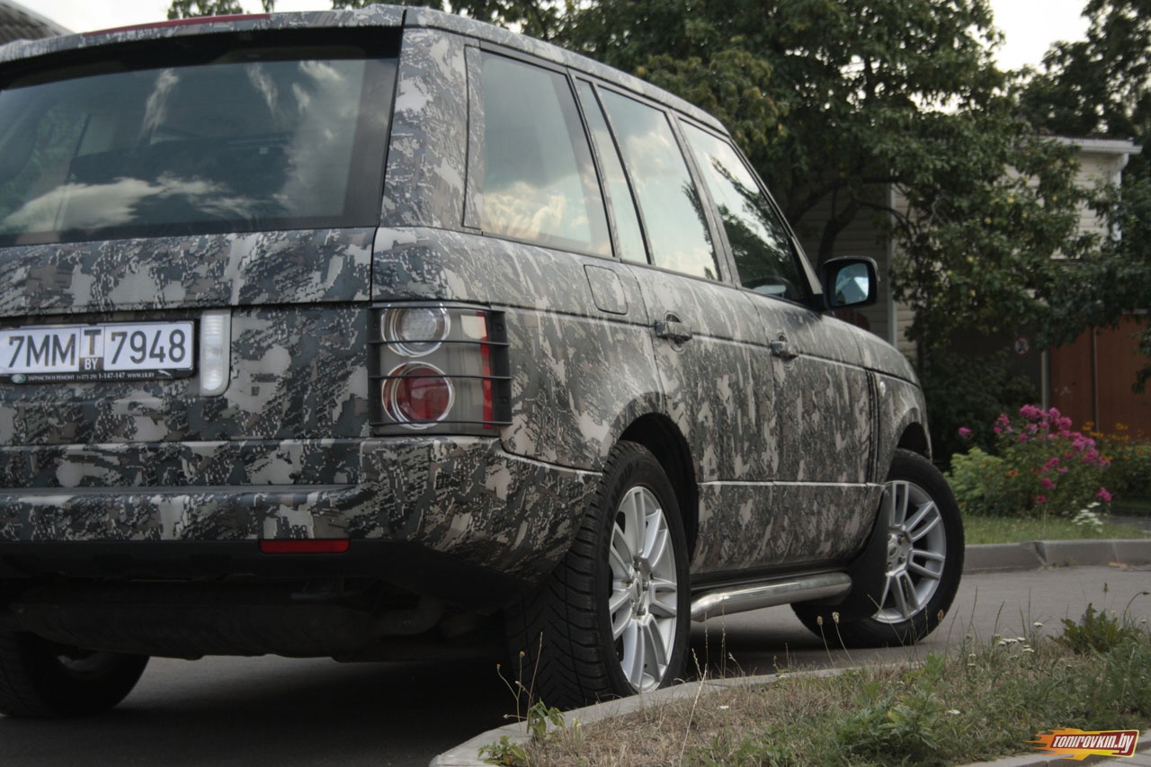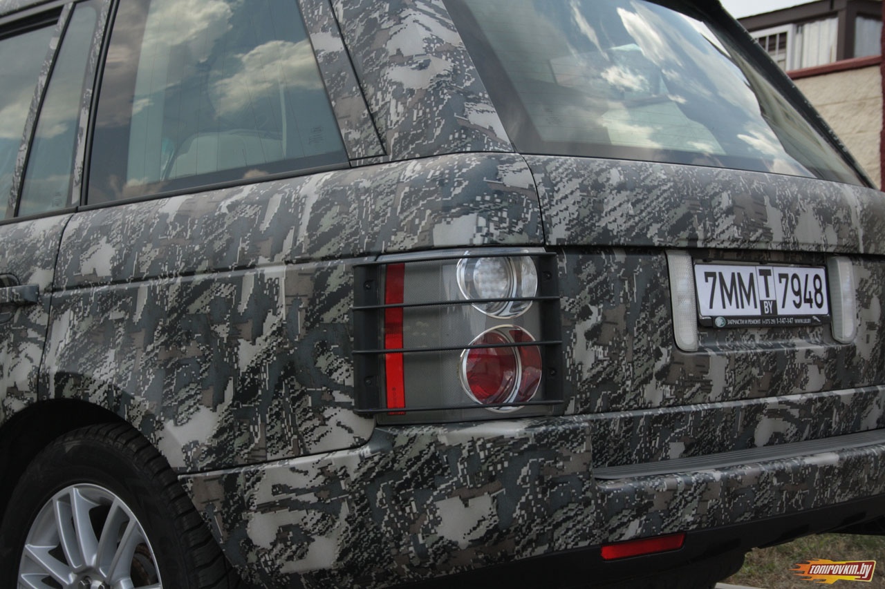 Главная Галерея работ Оклейка пленкой под цифровой камуфляж Range Rover Vogue